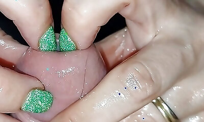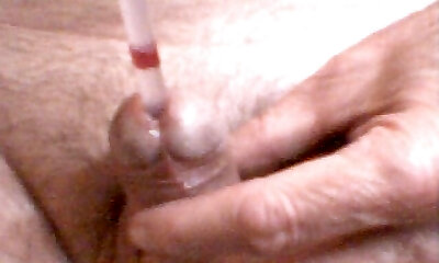 Urethral investigating of a thick dick ended with a cumshot on the Milf chest and underarm. Urethral penetration