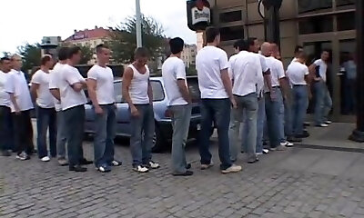 Slutty brunette fucked rigid by 30 boys in this gangbang film