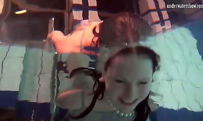 Sexy redhead doll Ala and her GF swim nude in the pool