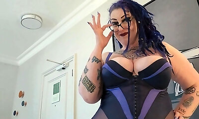 BBW Milf with big orbs and tattoos gives pierced cock a hand job.